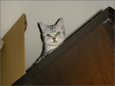 先日から道場(ちびちびたちの部屋)で物音がすることが多くなり、なんだろう?と思っていると、どうやらにゃんこタワーを登り、カーテン、そしてカーテンレールも制覇し、クローゼットを征服した模様・・・。