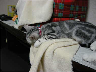 フリースにふみふみ(我が家では「ぐーぱー」といいますが・・・)したあと、眠ってしまったゆずです。少しテレビボードから手がおちているのがポイントでしょうか。